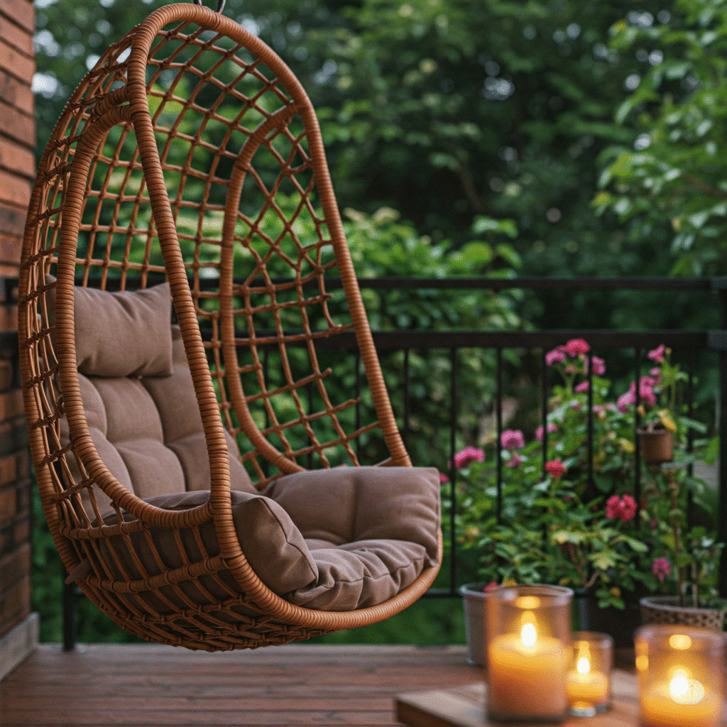 - Hamacas o sillones colgantes: Perfectos para crear un rincón de relax