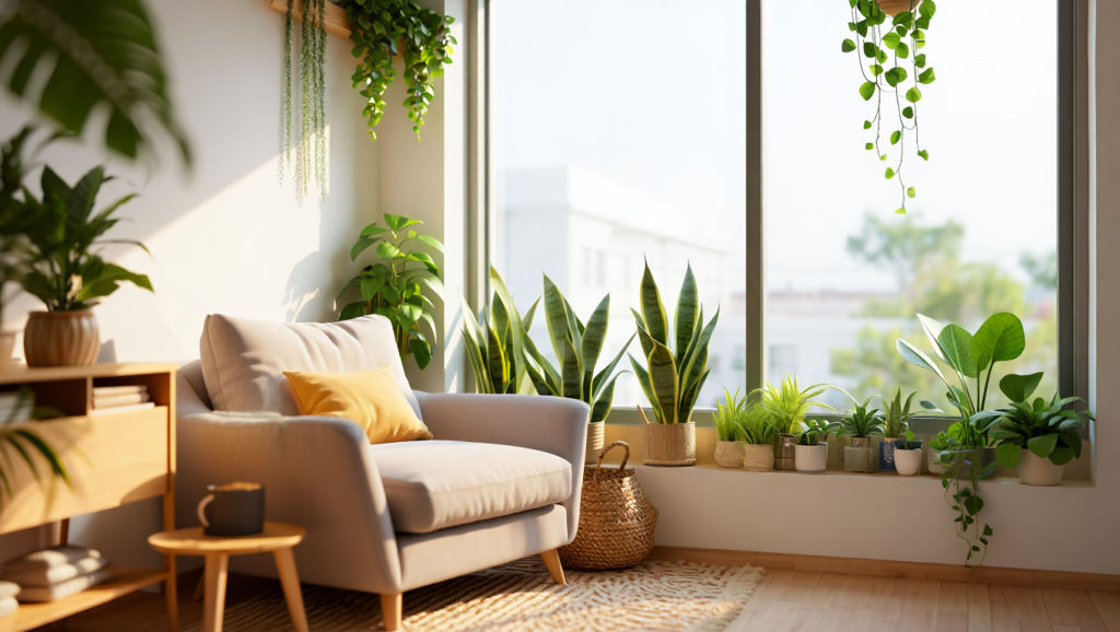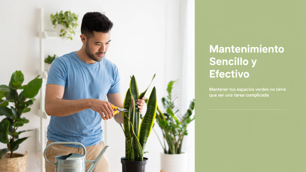 - Considera plantas de bajo mantenimiento como la sansevieria, potos o la zamioculca.